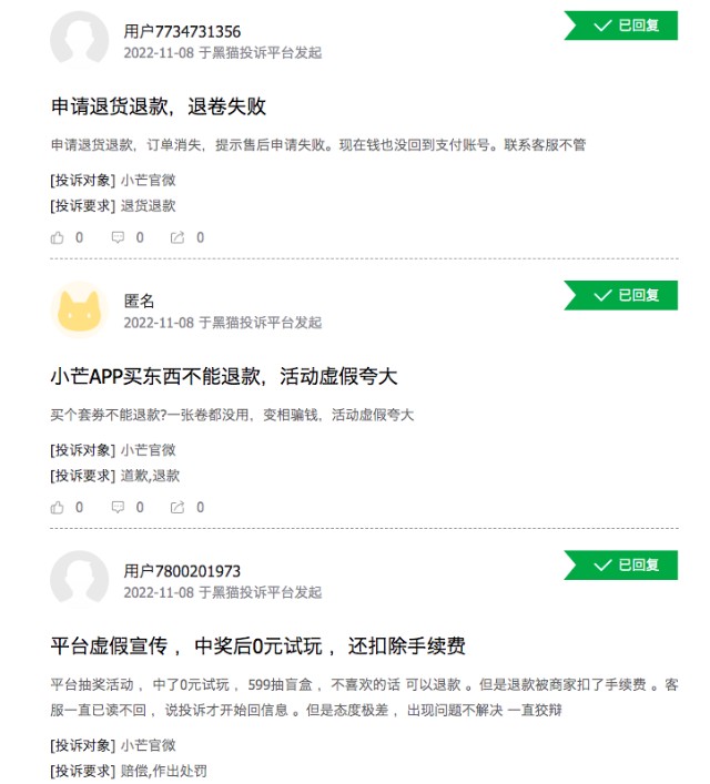 不过据黑猫投诉平台显示,最近30天内,小芒电商被用户投诉了50次,有人投诉小芒APP买东西不能退款,活动虚假夸大,也有用户投诉小芒平台虚假宣传,中奖后0元试玩,还扣除手续费。