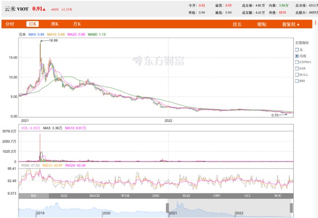 截至美东时间2022年11月18日收盘,云米股价报0.91美元/股,总市值为6311万美元,相较2021年2月19日的高位18.99美元/股已跌超九成,高达95.2%。