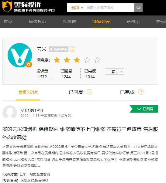 一方面,云米需要减少不必要的营销费用支出。「子弹财观」注意到,在黑猫投诉平台上,涉及云米的投诉合计达1372条,而网友们对云米的投诉主要为产品质量差、售后服务差、三包不到位、虚假宣传、不退款以及不发货等。