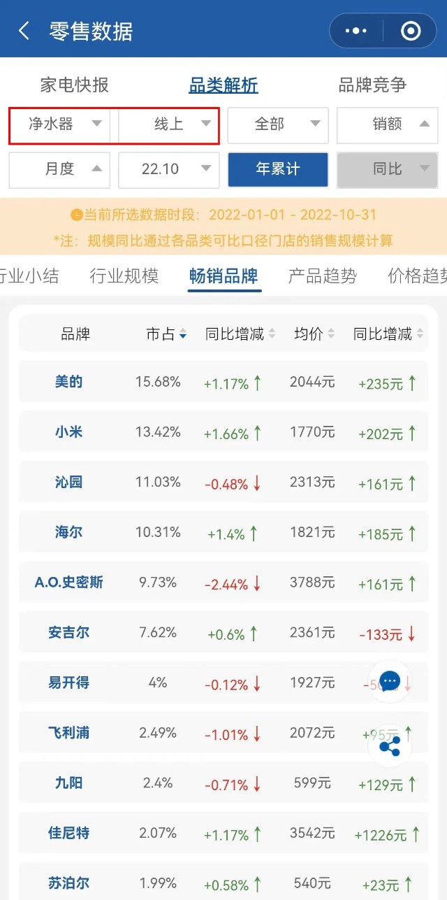 不过,目前云米的产品竞争力还不够强劲。以云米的“拳头产品”净水器为例,据奥维云网数据显示,2022年前10个月云米在净水器线上市场的占有率仅为1.53%,排名第13;在净水器线下市场的占有率排名尚未进入前20。
