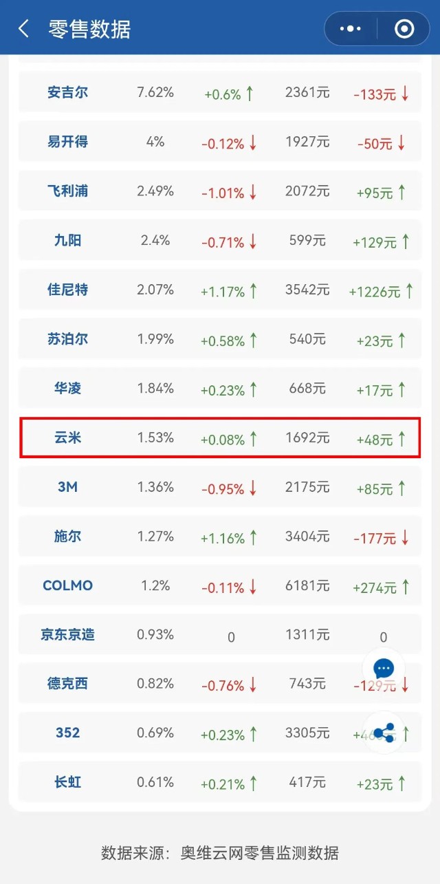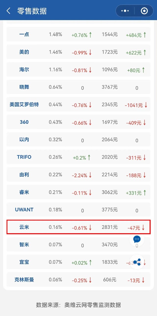 而云米在电饭煲、集成灶、洗碗机等其他很多品类的零售额占有率排名均十分靠后。可以说,云米“贪多嚼不烂”的意味浓厚。