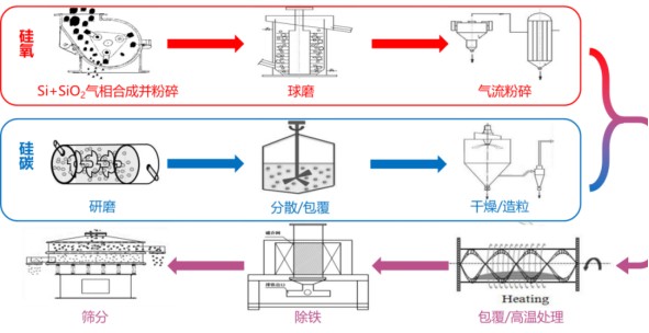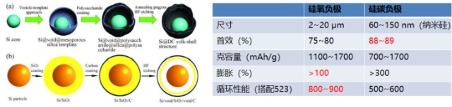 图4 硅氧和硅碳颗粒示意图及性能特点
