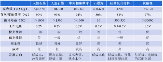 备注:负极克容量指每克负极活性物质所能释放出的电量,这一指标决定了电池整体的比容量和能量密度。首次效率是指电池首次充放电过程中,放电容量与充电容量的百分比。首次效率越低则代表首次充电时会形成固体电解质(SEI)膜并消耗大量来自正极材料的活性锂,降低电池容量。钛酸锂对锂电位为1.5V,首次充电不形成SEI膜,是当下首次效率最高的负极材料。循环寿命和安全性是需求端关注的重要指标。钛酸锂在电池循环过程中不会析锂,材料稳定性强,在循环寿命和安全性表现突出。快充性能和倍率性能主要指锂离子快速从正极嵌入和脱嵌并不产生锂离子沉积的能力。也决定了电池的充电速率和低温下的性能表现。