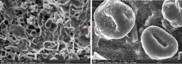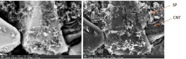 负极极片表面硅碳颗粒(左图)表面导电网路(右图)颗粒形貌