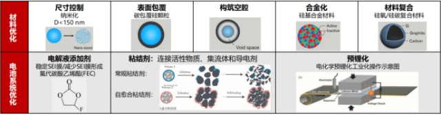 电池体系优化主要解决了硅基负极与锂电池其他主材的配套问题。新型电解液添加剂可以减少SEI膜形成,提高硅基负极的电化学性能。新型高粘性和愈合型粘结剂能较好维持电极完整性,避免体积膨胀所导致的电极粉化现象。预锂化可分为电化学预锂化和物理预锂化两种途径,通过预先嵌锂的方式增加了电池体系内的锂含量并减少SEI膜对锂的消耗,明显提高了首次库伦效率。目前部分材料优化技术已实现应用,电池体系优化路径还处于研究阶段。