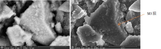 如图所示,循环前负极表面可清晰看见SP(导电炭黑)和CNT(碳纳米管)均匀分布在颗粒表面,形成了良好的导电网络;循环后负极表面有厚重的SEI膜形成,对离子迁移率和导电网络形成较大阻碍。