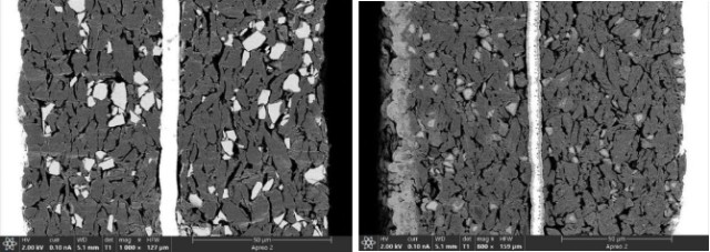 负极极片截面硅氧颗粒的分布(左图)循环前、(右图)循环后