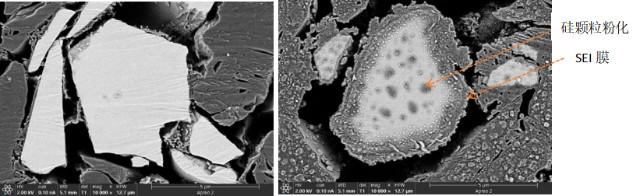 循环前负极硅颗粒截面光滑平整,SiOx相连续无杂质。石墨与硅外界面无SEI膜;循环后负极硅颗粒截面可明显看出晶粒粉化黑点,外界面呈现厚重SEI膜。负极粉化和导电网络部分失效是导致负极活性物质衰减的主要原因。
