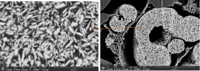 负极极片截面硅碳颗粒(左图)局部放大图(右图)整体颗粒形貌