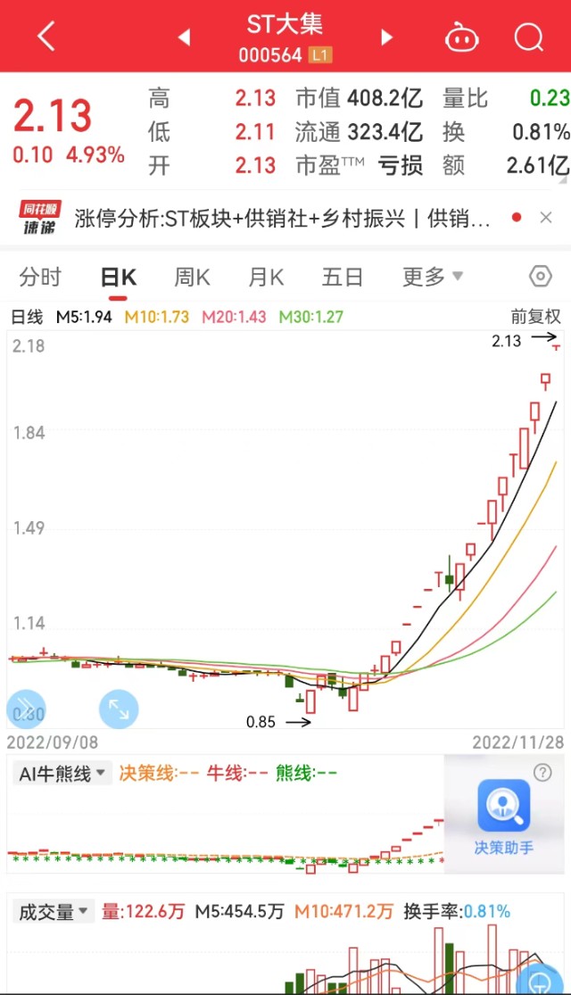 事实上,月初时的ST大集还在因连续十八个交易日收盘价低于1元,公司股票存在可能因股价低于面值被终止上市的风险。但短短一个月不到,公司股价已翻倍,成功暂别退市风险。而公司的股价的上涨,很大程度上得益于供销社概念的热炒。