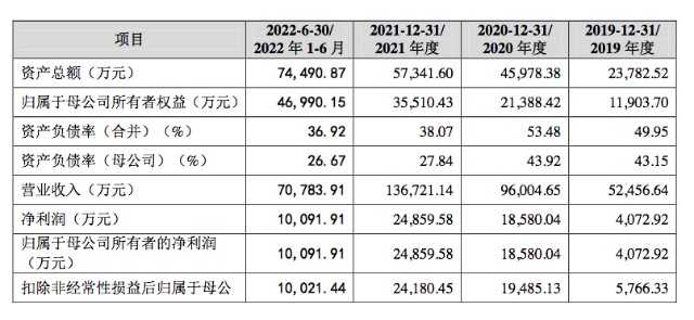 从2019年到2022年上半年,睿联技术的营收分别是5.246亿元、9.6亿元、13.672亿元、7.078亿元。同期的净利润分别是4072.92万元,1.858亿元、2.486亿元、1.009亿元。他们的研发投入占营收的比例分别是7.77%、3.38%、3.46%和4.16%。