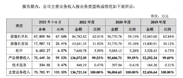 其中摄像机单机和摄像机套装这两大业务的合计营收占比在过去3年半里均超过90%,他们的产品十分单一。