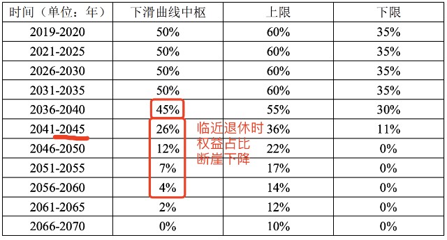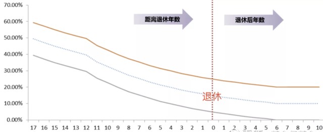 指:一般采取“权益仓位下滑曲线”策略,即结合投资者的退休年龄,按一定规则,逐步下调权益资产比例,这也是依据投资者不同生命阶段风险承受能力的需求,进行科学的投资配置。