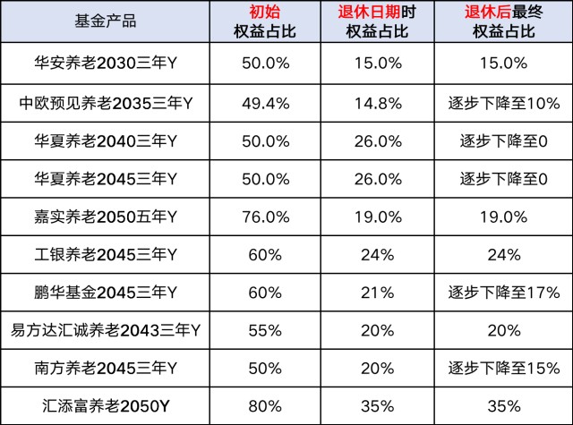 跟易方达2043很像,都是50%初始,退休就20%。但是,南方这只也是从退休前20年(2023年)就开始降低仓位了,并且,退休后持续调整降低仓位。因此,也属于偏保守的。