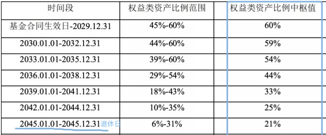 初始权益占比为60%,退休后的权益占比维持在24%—— 这2个时期的权益占比,相比其他2045基金来说,都更激进。
