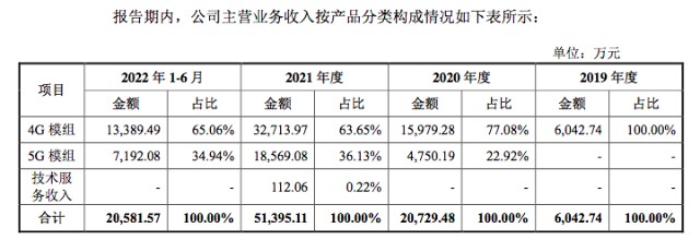 2019年慧智微电子只有4G模组,当年的营收为6042.74万元,2020年4G模组的营收为1.598亿元,营收占比为77.08%,5G模组的营收为4750.19万元,占比为22.92%。2021年他们的4G模组营收为3.271亿元,占比63.65%,5G模组营收快速增长到了1.857亿元,占比36.13%。2022年上半年,他们的4G模组营收为1.339亿元,占比65.06%,5G模组营收为7192.08万元,占比34.94%。