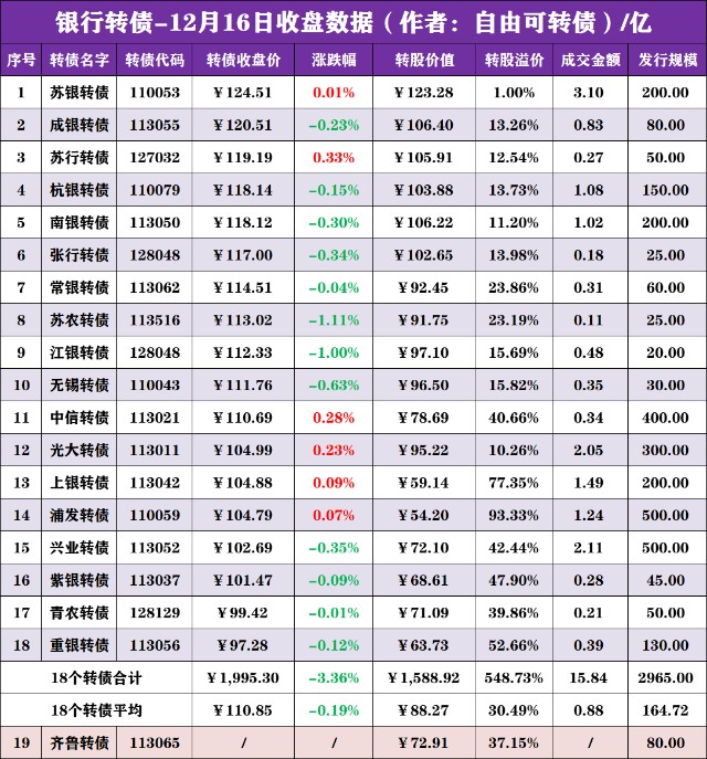 银行转债:18只已上市银行转债中,共有青农转债、重银转债,转债价值低于100元。