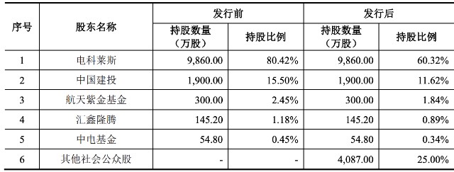 除了电科莱斯外,莱斯信息的股东还包括中国建投、航天紫金基金等,其中中国建投对莱斯信息的持股比例为15.50%,航天紫金基金持股2.45%,汇鑫隆腾持股1.18%,中电基金持股0.45%。