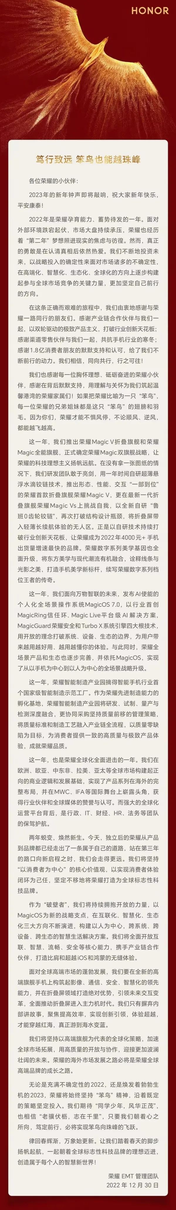 2022年12月30日,荣耀EMT管理团队发布新年致辞,回顾2022,确定Magic系列双旗舰战略、发布MagicOS 7.0操作系统、摘得国家级智能制造示范工厂、全球化全面进击以及对技术无人区的持续坚定探索……一长串的成绩单,以及一连串干脆利落的行动与布局,是“单飞”两年的荣耀交给市场的答卷;逆周期强势回归头部阵营,则是市场给予勇敢者的褒奖。
