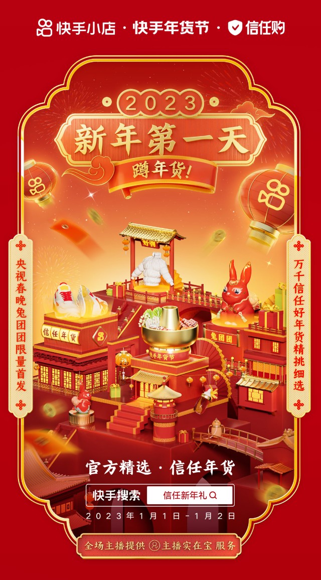 1月1日-1月2日,快手小店举办“信任好年货”新年专场活动,与新入驻快手的CCTV中视购物合作打造2023春节联欢年货节直播,并在快手电商独家首发2023年央视春晚总台文创“兔团团”生肖形象。活动引发广泛关注和讨论,全网话题相关视频累计播放量超过1亿,活动期间中视购物频道官方快手账号粉丝量增长达3698%,参与专场的主播累计GMV达4798万,直播被观看7733万次,众多信任主播登上快手卖货榜实时第1名。