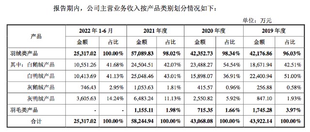 在羽绒类产品中,又分为白鹅绒产品、白鸭绒产品、灰鹅绒产品和灰鸭绒产品,其中白鹅绒和白鸭绒产品在过去3年半的时间里营收占比各有4成左右,是公司主营业务收入的主要来源。