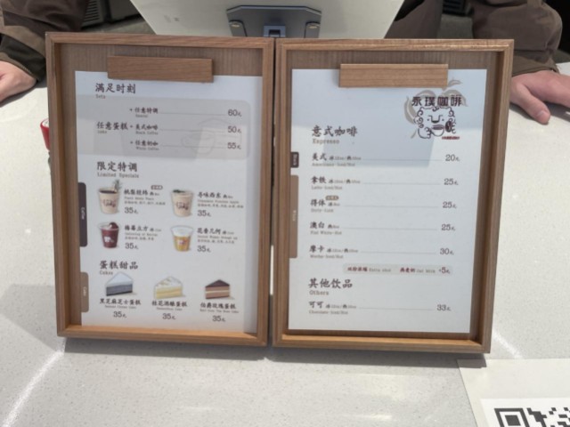 菜单显示,店内主打4款限定特调、5款意式咖啡、3款蛋糕甜品。这4款特调是专门为徐家汇书院店量身打造的,定价35元一杯,包括寻味西东、桃梨经纬、莓梅立方、花香几何,采用了埃塞日晒、厌氧浓缩咖啡液。意式咖啡有美式、拿铁、得体、澳白和摩卡,从20到30元不等,双份浓缩、加燕麦奶需要另加5元。蛋糕有黑芝麻芝士、桃花酒酿、伯爵玫瑰3种口味,均为35元。