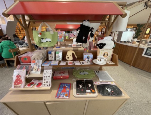 咖啡吧台的左手边设置了三台木质货架,以推车造型营造出庙会赶集的氛围,售卖多个插画设计品牌的文创,包括:EVENOlab、TUNEE GOODS、AKISTORE、COOKIEBOX、Caro.Ni。设计师多来自上海,非常年轻,作品色彩明快、走治愈可爱风格。