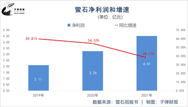 再看净利润。招股书披露,2019年、2020年和2021年萤石的净利润增速分别为59.81%、54.53%和38.17%,呈逐年趋缓之势。