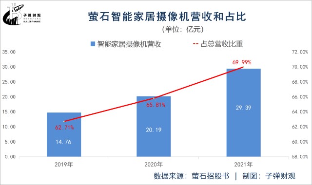 「子弹财观」注意到,萤石其实也面临营收单一的问题。招股书显示,2019年、2020年和2021年,智能家居摄像机业务为萤石贡献的营收比重分别为62.71%、65.81%和69.99%,呈逐年上涨趋势,且一直都在60%以上。