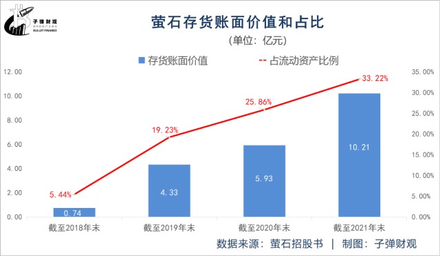 此外,萤石的存货账面价值正逐年增加。根据招股书,2018年末-2021年末,萤石的存货账面价值依次为0.74亿元、4.33亿元、5.93亿元和10.21亿元。