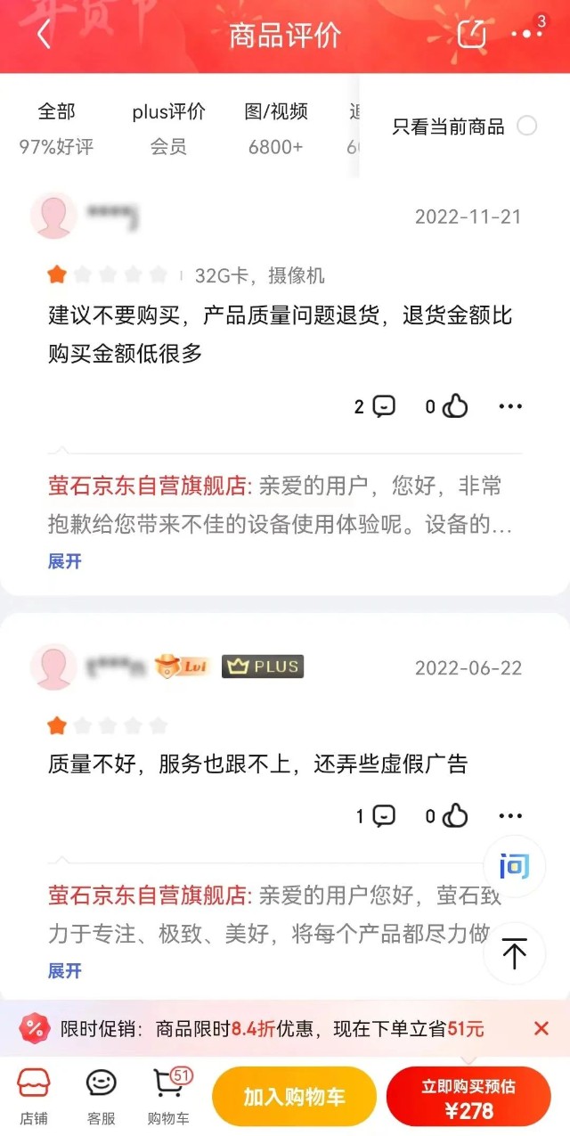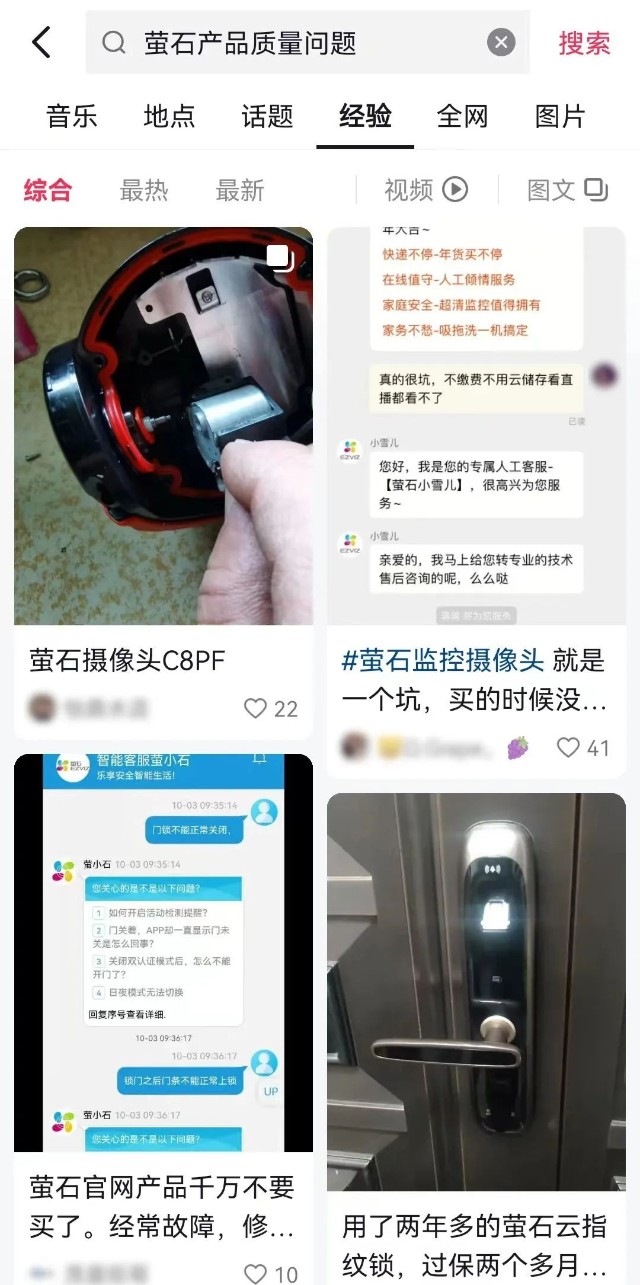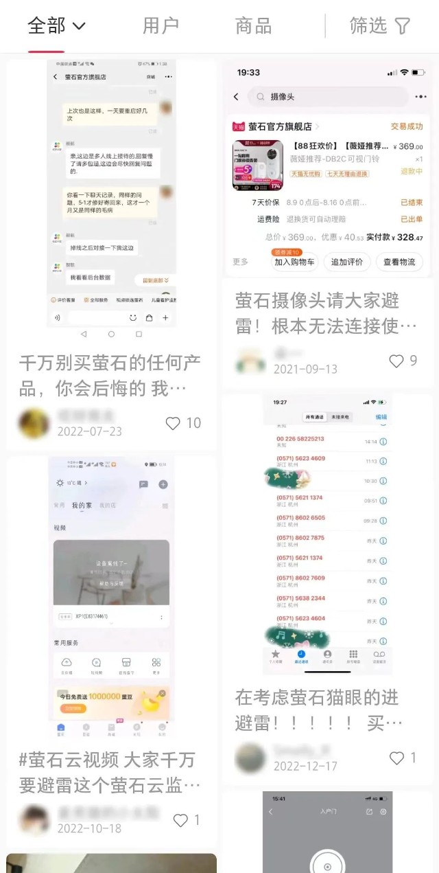 还有就是,萤石也面临口碑信誉下滑的风险。「子弹财观」注意到,无论是在抖音、小红书等社交平台,还是在天猫、京东等电商平台,抑或是在黑猫投诉等投诉平台上,都有不少关于萤石产品质量问题的投诉。
