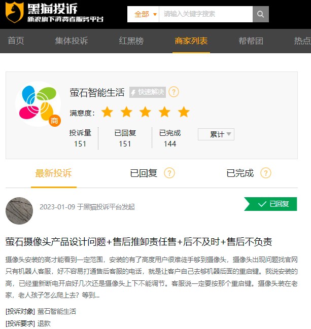 在黑猫投诉平台上,涉及萤石的投诉合计达151条,而网友们对萤石的投诉除了产品质量差,还涉及售后服务差、虚假宣传、虚假发货等。