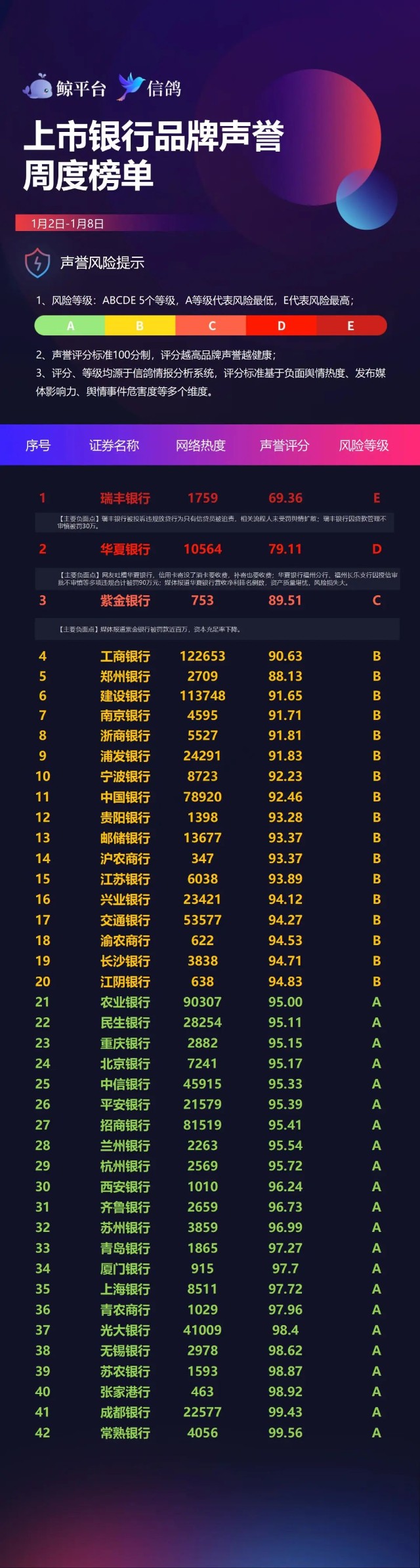 近年来,随着移动互联网的发达与自媒体的发展,声誉风险是金融机构面临的主要风险之一。为了帮助银行更好地提高合规意识和品牌形象,财联社旗下鲸平台,联合舆情分析系统产品-信鸽,以权威法规为指导,利用专业大数据技术,共同制定了声誉风险评分体系,于每周发布上市银行品牌声誉周度榜单。(注:文章内容来源于网络公开素材整理)