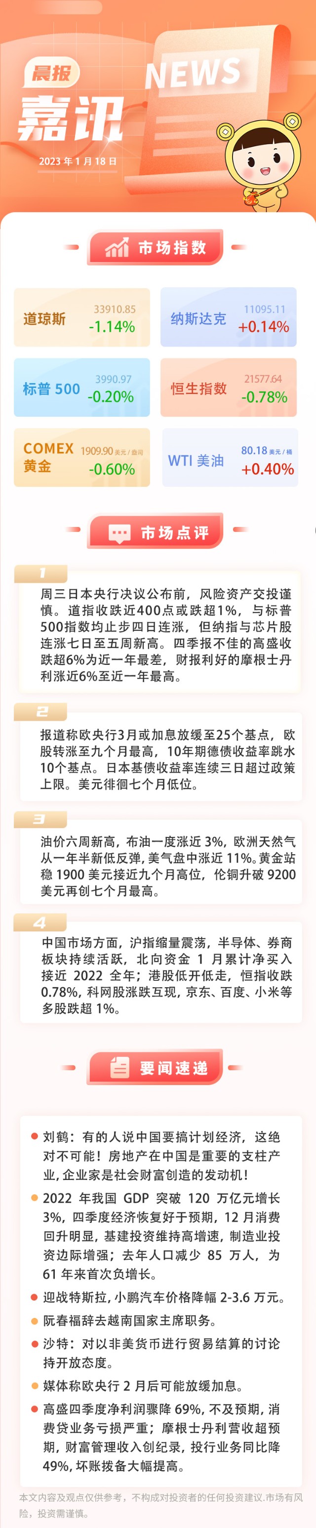 1月18日嘉讯:三大美股指涨跌不一,A股沪指缩量震荡半导体券商板块持续活跃