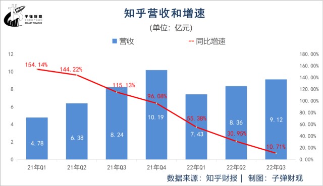 首先,知乎的营收增速在逐季放缓。根据知乎往期财报,最近7个财季(2021年Q1-2022年Q3),其营收增速依次为154.14%、144.22%、115.13%、96.08%、55.38%、30.95%和10.71%。