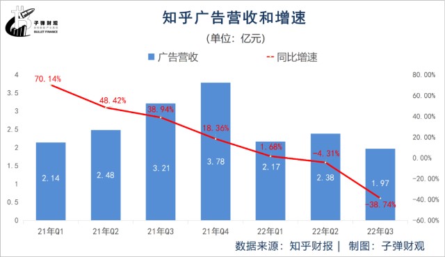 具体来看,知乎的广告营收增速正逐季趋缓。财报显示,在过去的7个财季(2021年Q1-2022年Q3)里,知乎广告营收增速分别为70.14%、48.42%、38.94%、18.36%、1.68%、-4.31%和-38.74%。