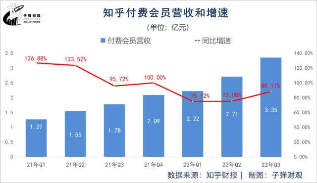 再则,知乎的付费会员营收增速呈总体趋缓之势。财报显示,在过去的7个财季(2021年Q1-2022年Q3)里,知乎的付费会员营收增速分别为126.88%、123.52%、95.72%、100.00%、75.12%、75.08%和88.11%。