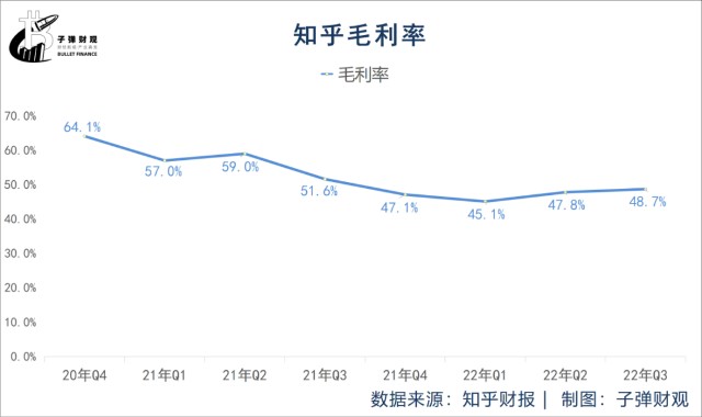 最后,知乎的毛利率也呈总体下滑的势头。根据已公开的财报,最近8个财季(2020年Q4-2022年Q3),知乎的毛利率分别为64.1%、57.0%、59.0%、51.6%、47.1%、45.1%、47.8%和48.7%。