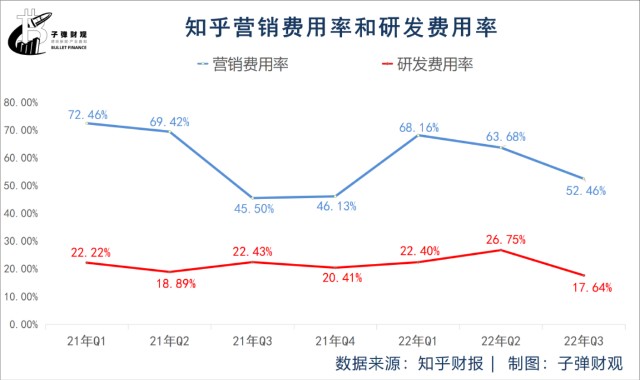 财报显示,在过去的7个财季(2021年Q1-2022年Q3)里,知乎的营销费用率(营销费用率=营销费用/营收*100%)一直位于研发费用率(研发费用率=研发费用/营收*100%)之上,差距最大出现在2021年Q2,高达50.53%;差距最小发生在2021年Q3,为23.07%。