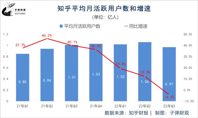 值得关注的是,知乎的月活表现并不乐观。根据最新财报,2022年第三季度知乎的平均月活跃用户数为0.97亿人,同比下降4.2%,环比下降8.4%。