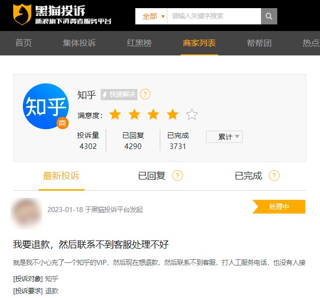 此外,知乎正陷入口碑信誉下滑的尴尬境地。「子弹财观」注意到,在黑猫投诉平台上,涉及知乎的投诉合计高达4302条,而网友们对知乎的投诉主要为自动续费、客服服务差、提前取消会员资格及不退款等。
