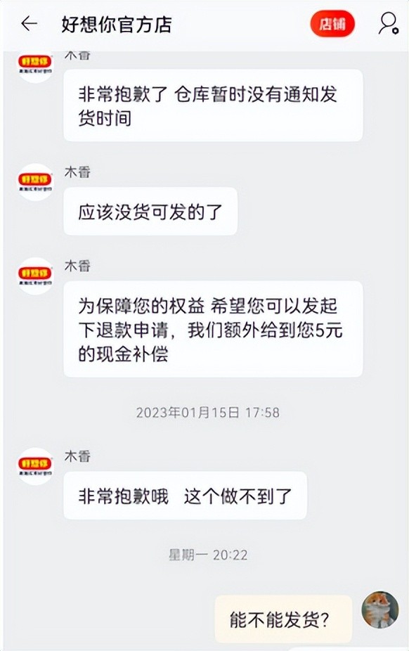 1月19日,一位网友投诉称好想你官方店拒绝发货,她表示1月14日从淘特好想你官方店购买的3袋枣夹核桃,15日却被告知不发货并拒绝发货,说是没货了,但这位网友的朋友那边却能正常发货,因此她要求必须发货。