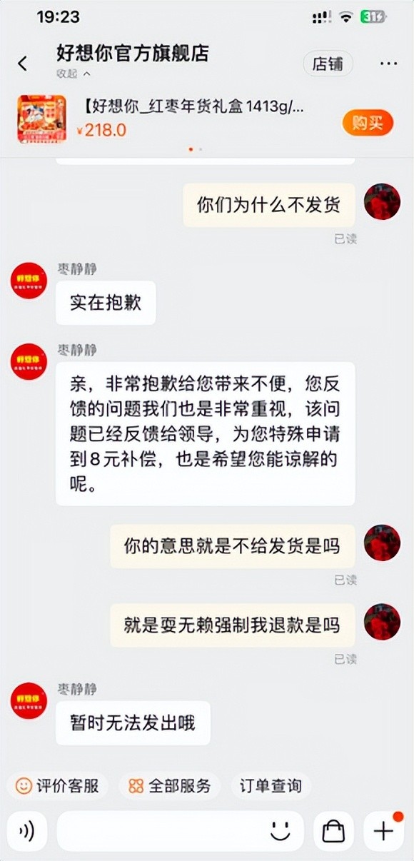 1月16日,另外一位网友发起投诉称他在12月30日下单3盒礼盒,但好想你旗舰店却不给发货。从这位网友透露的聊天截图中可以看到,好想你的客户称货物无法发出,只能给客户8元钱的补偿。但该网友坚决不退款,要求发货。因此他发起了投诉。
