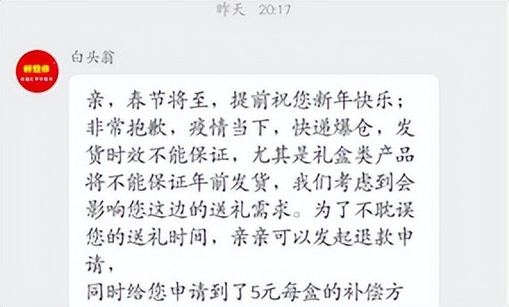 也有投诉者晒出了客服的回应是:“疫情当下,快递爆仓,发货时效不能保证,尤其是礼盒类产品将不能保证年前发货。”他们甚至建议部分客户可以发起退款申请。