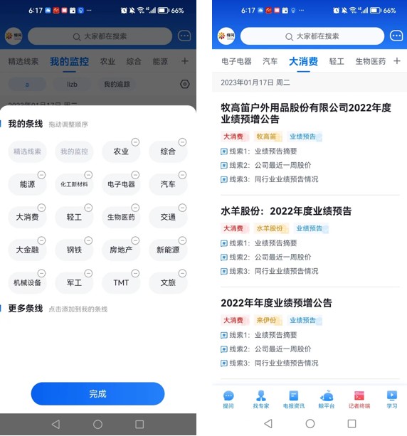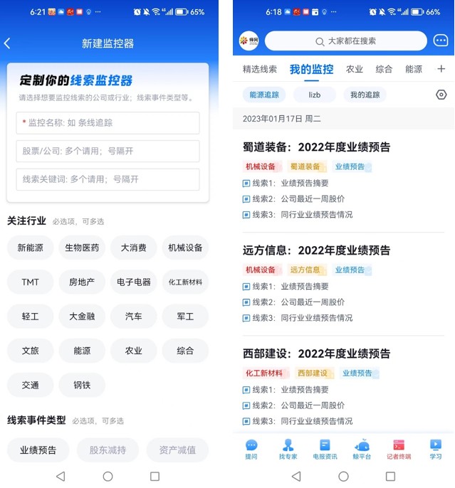 您可以根据感兴趣设置自己关注的报道条线,如新能源或大消费等条线。系统将自动筛选出该条线对应标的公司的相关线索。