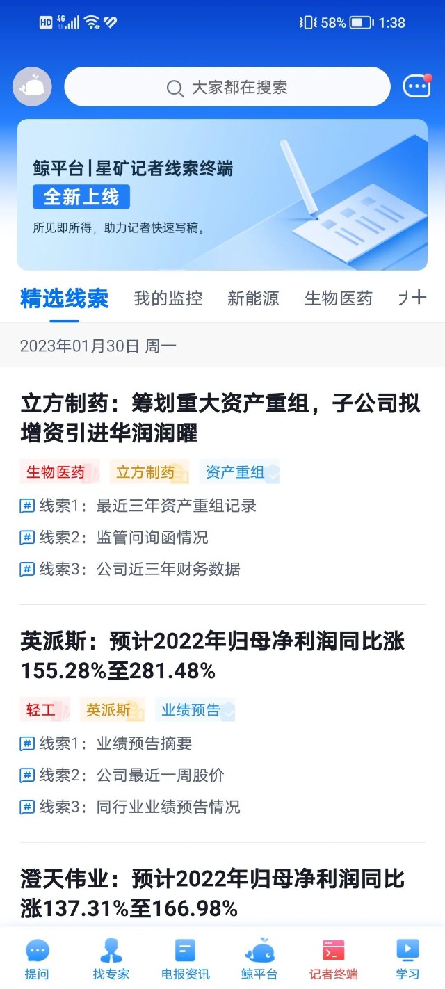 作为媒体从业者的您,可以通过精选线索了解到当天从海量线索中精选出来的线索,有助于您尽快掌握热点选题。目前终端第一期主要是针对部分公告类型(业绩预告以及资产重组),每个公告会有对应3条拆解的线索。