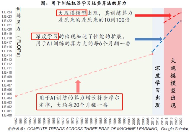 中信建投研报的数据也显示,此前用于AI训练的算力增长符合摩尔定律,大约每20个月翻一番;深度学习的出现加速了性能的扩展,用于AI训练的算力大约每6个月翻一番;而目前大规模模型出现,其训练算力是原来的10到100倍。
