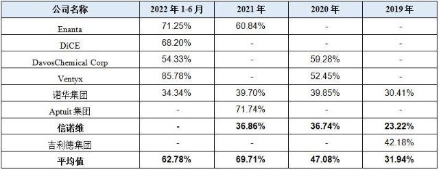 报告期内,六合宁远业绩较为亮眼,创造营业收入1.7亿元、2.7亿元、4.2亿元以及2.4亿元,营业收入增长率分别为23.13%、62.87%和53.98%,远高于行业平均收入增长率49.81%、41.14%和37.88%。六合宁远不仅收入高速增长,毛利率也不甘下风,尤其是CDMO业务对应的毛利率随着行业竞争的加剧不降反升,发行人2019年CDMO业务毛利率为36.66%,经过几年的稳步提升,到2022年上半年已经达到57.50%,着实令人惊叹。而行业内CDMO业务的毛利率水平是相对稳定甚至有所下降的,可比公司CDMO业务各期毛利率分别为49.74%、48.88%、44.45%以及44.48%,对比之下,六合宁远的毛利率走势恰恰与之相反。