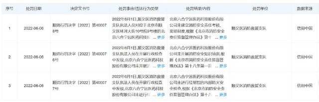 CRO/CDMO企业在研发、生产过程中会产生废水、废气及固体废弃物等污染物的排放,若处理不当,将对周边环境会造成污染,在装卸、搬运、贮存及使用过程中操作不当或维护措施不到位,可能会导致发生安全生产事故。如下表,天眼查显示2022年6月,六合宁远就因消防安全问题收到过3张罚单。