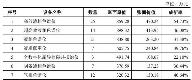 如下表所示,六合宁远超高效液相色谱仪等多项重要大额固定资产设备成新率低于50%,招股书中披露主要的专用设备综合设备成新率仅为52.32%。固定资产成新率反了企业所拥有的固定资产的新旧程度,与目前的生产能力基本相适应,体现了企业固定资产更新的快慢和持续发展的能力。该指标高,表明企业固定资产比较新,对扩大再生产的准备比较充足,发展的可能性比较大。